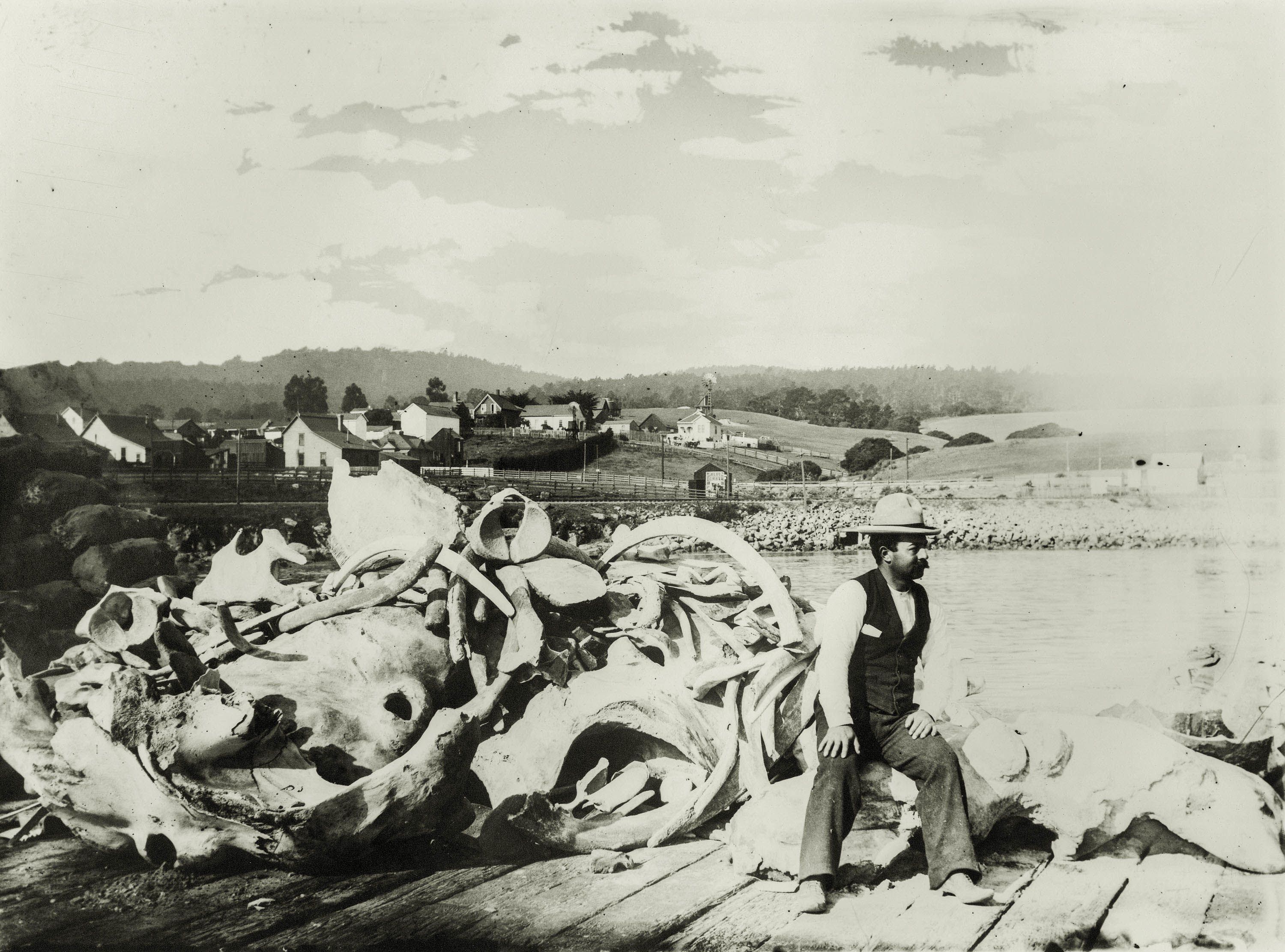 Mike Noon, one of the last whalers of Monterey Bay California, sitting on a pile of whale bones, 1880-1895. Image courtesy of the New Bedford Whaling Museum.