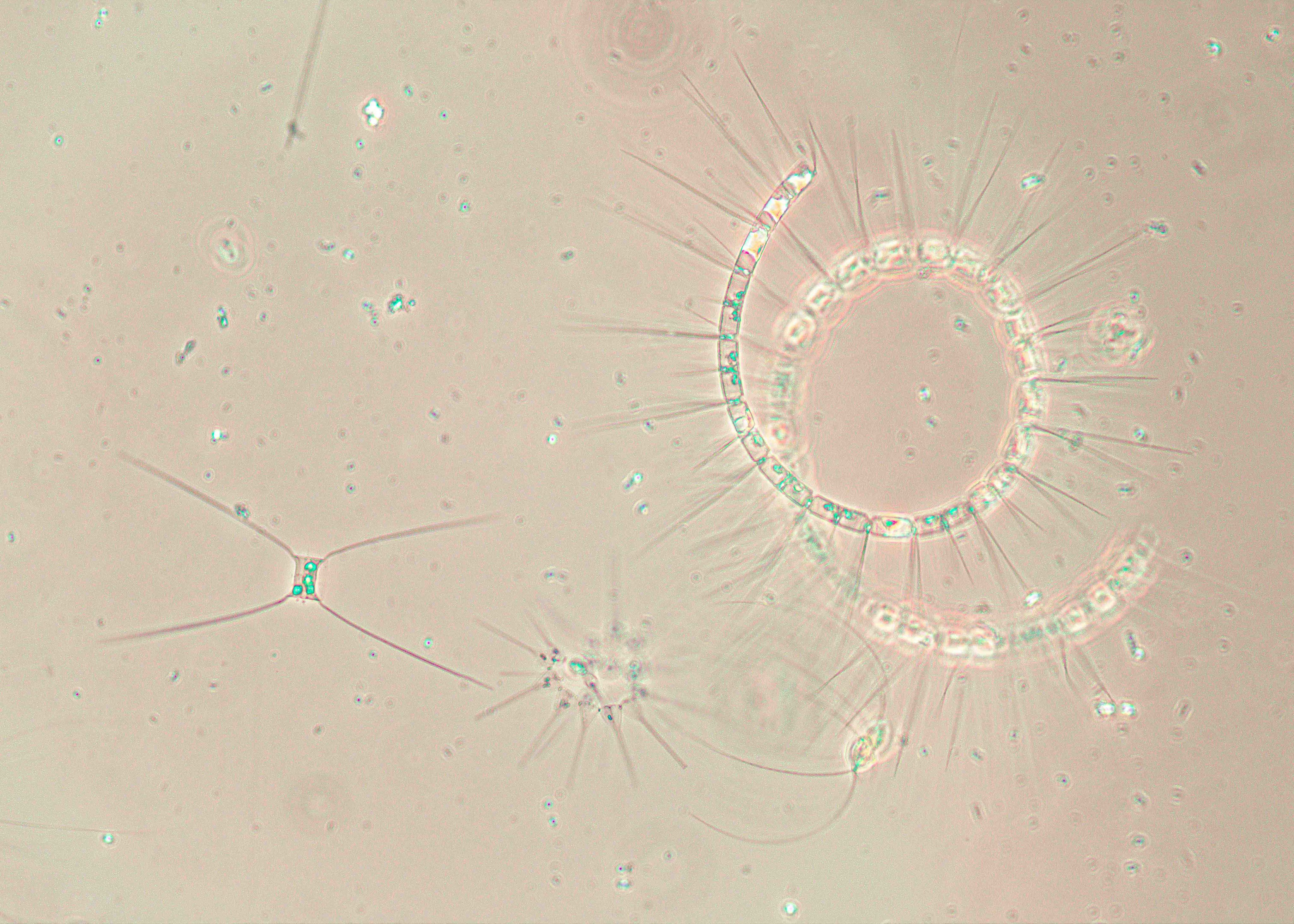 Left to right: Phytoplankton species Chaetocerous sp., Asterionellopsis sp., and Chaetocerous sp.