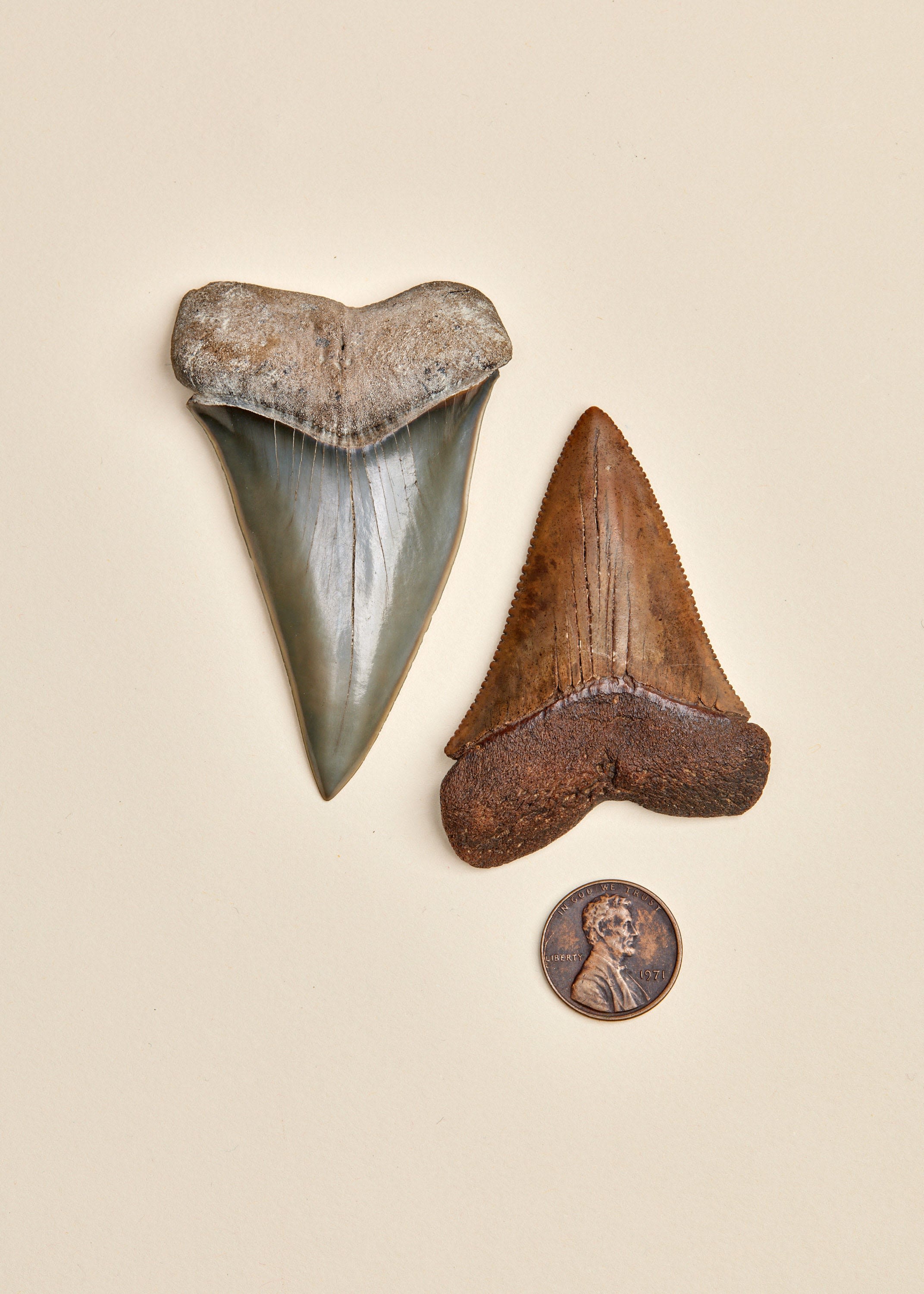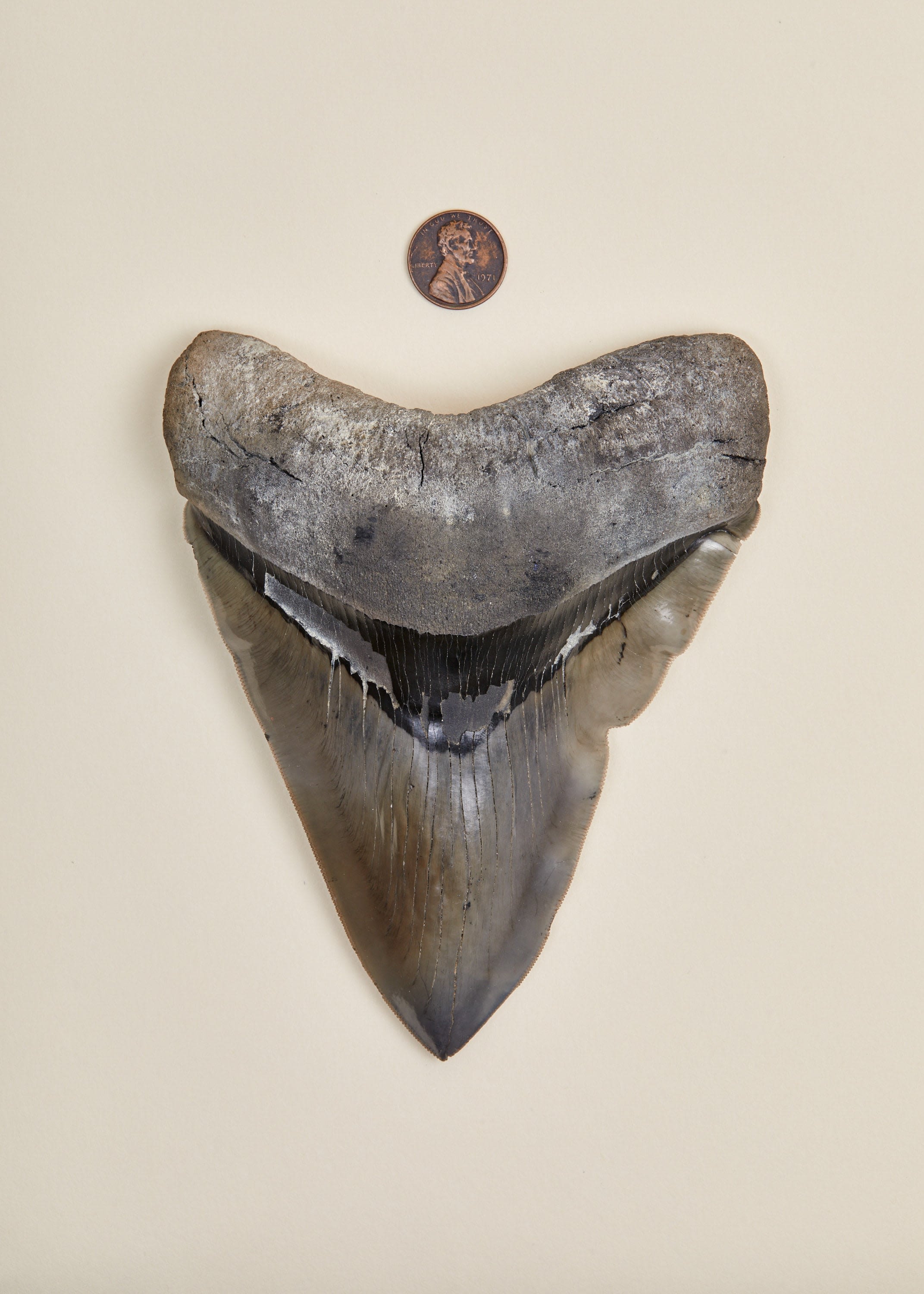 A large 5.8 inch Otodus megalodon tooth with a penny for scale. Yorktown Formation, Edgecombe County, NC.