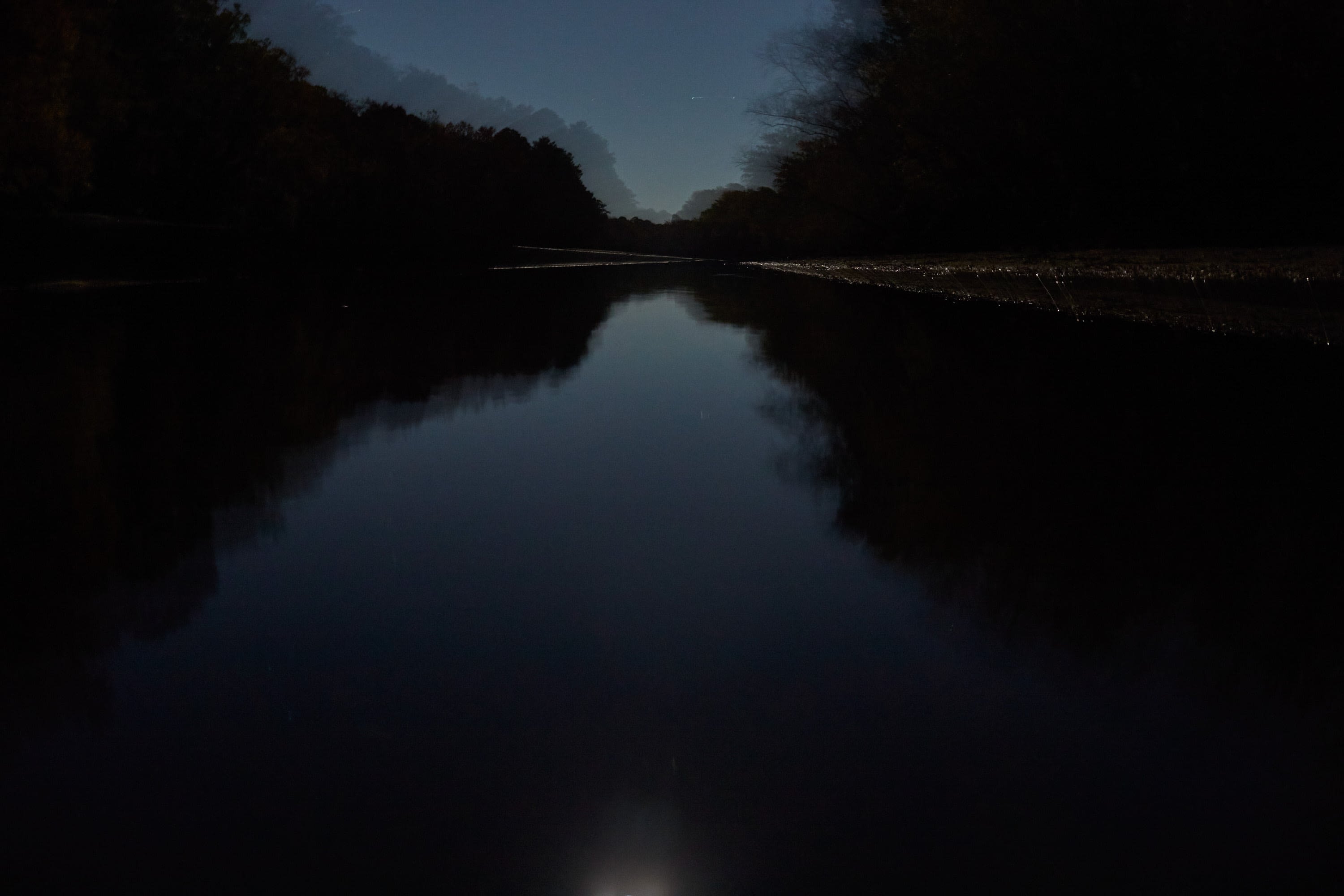 The Tar River at Princeville under the full moon in 2021, where the old sea used to be. The river is low, approaching drought stage, so the edges of exposed sandbars glisten in the moonlight.
