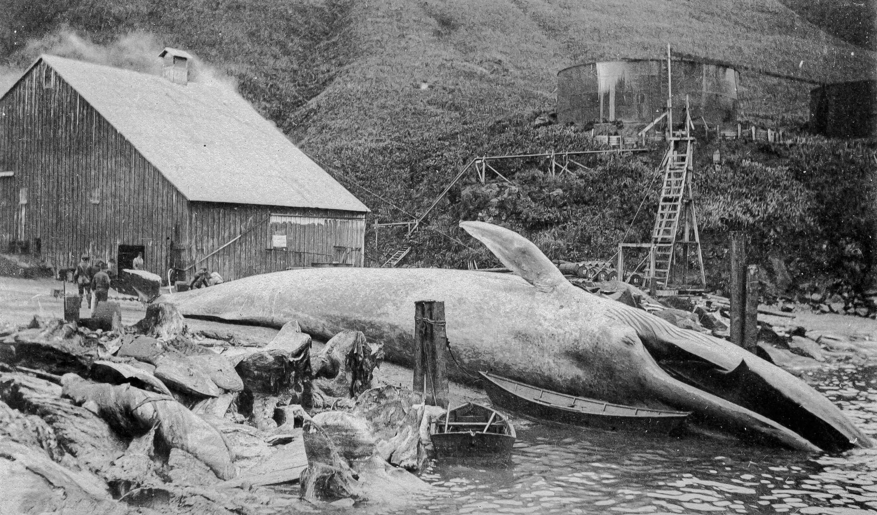 A blue whale being hauled onto the beach at Akutan Whaling Station, circa 1917. The Akutan Whaling Station was built in the Aleutians East Borough of Alaska by the Pacific Whaling Company in 1912, operating until 1939. Photo courtesy the New Bedford Whaling Museum.