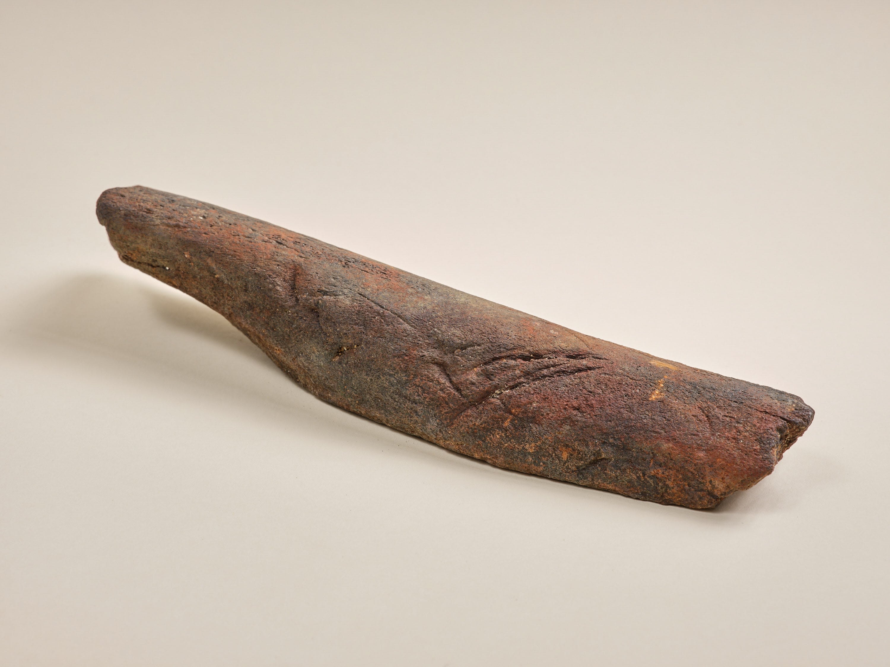 A fossil whale rib with deep gouges from the teeth of feeding sharks. Edgecombe County.