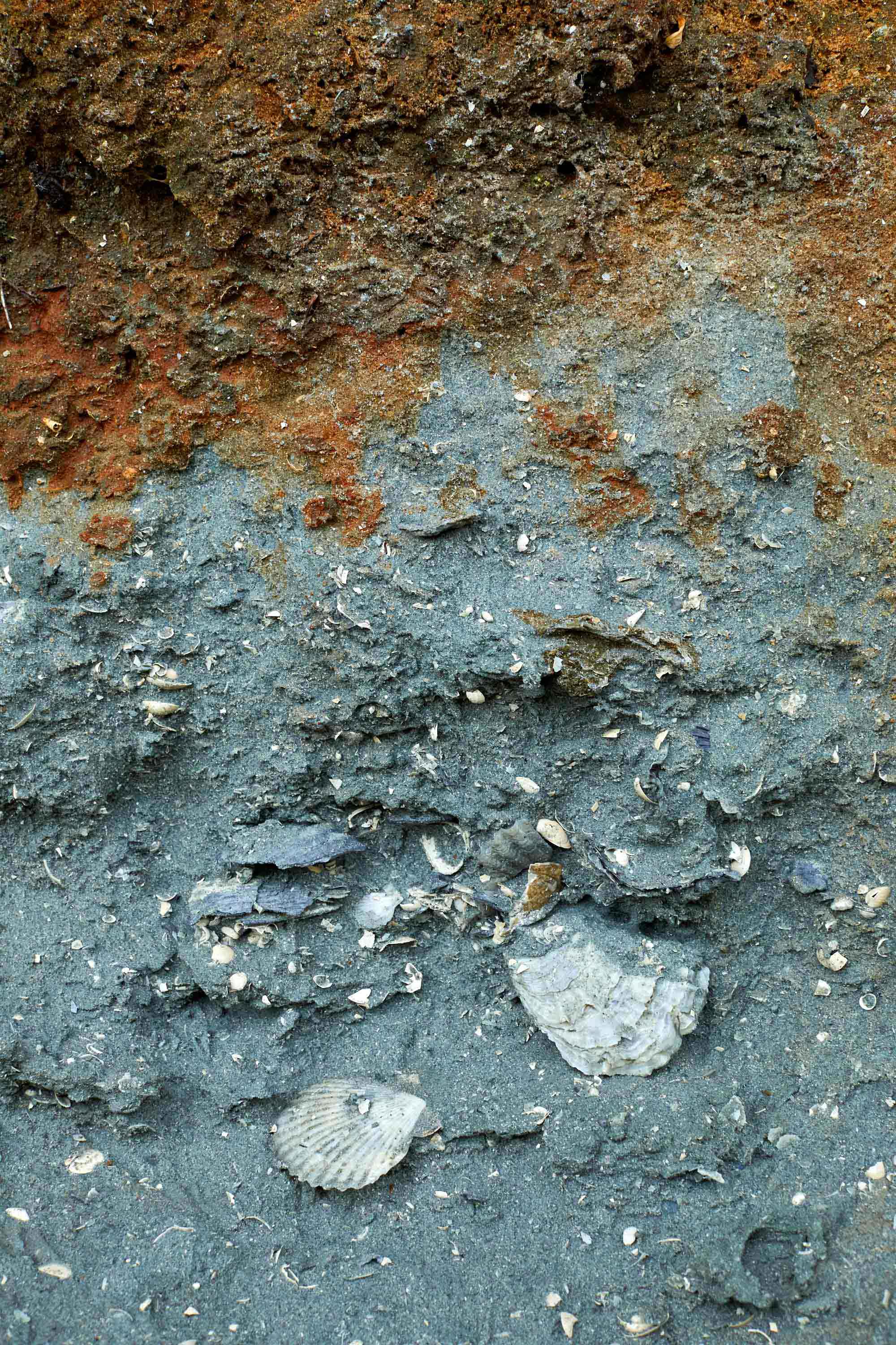 The blue clay of the Pliocene Yorktown Formation with 3-to-4 million-year-old scallops and oysters exposed by the Tar River near Tarboro, NC.