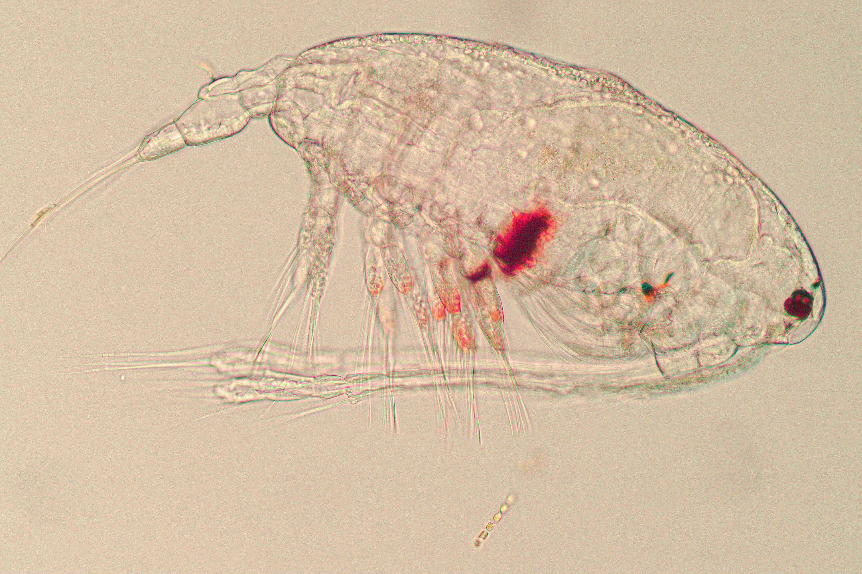 A microscopic species of zooplankton, likely a Calanus finmarchicus, above an even tinier phytoplankton viewed with a phase contrast microscope at the Institute of Marine Sciences at UNC Chapel Hill.